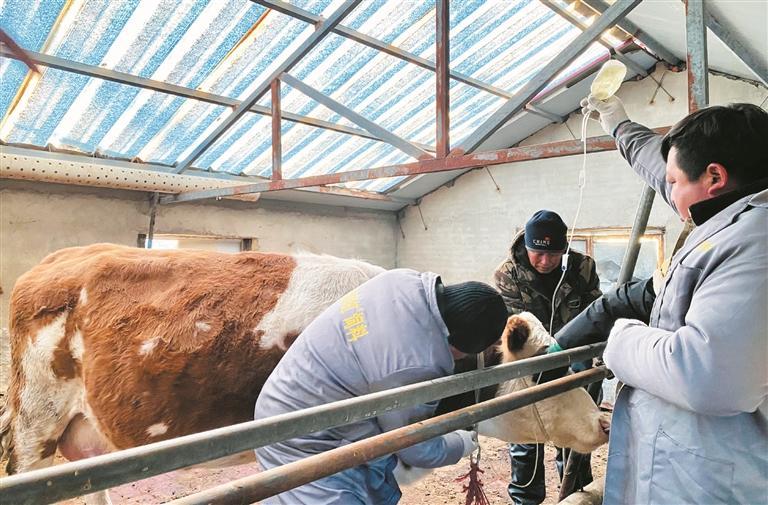 下午两点,中心兽医来到泊白嘎查养殖户宝迪萨那家,为他家的牛输液。这头牛生产一周后得了乳房炎,出现血乳现象,需要输液治疗。为更好地服务养殖户,该中心提供上门诊疗和网络远程诊疗双重服务,平均每月上门服务40余次、网络远程诊疗20余次。宝迪萨那说:“动物医院给我们周边的养殖户带来了很大的方便,打个电话兽医就过来了。”